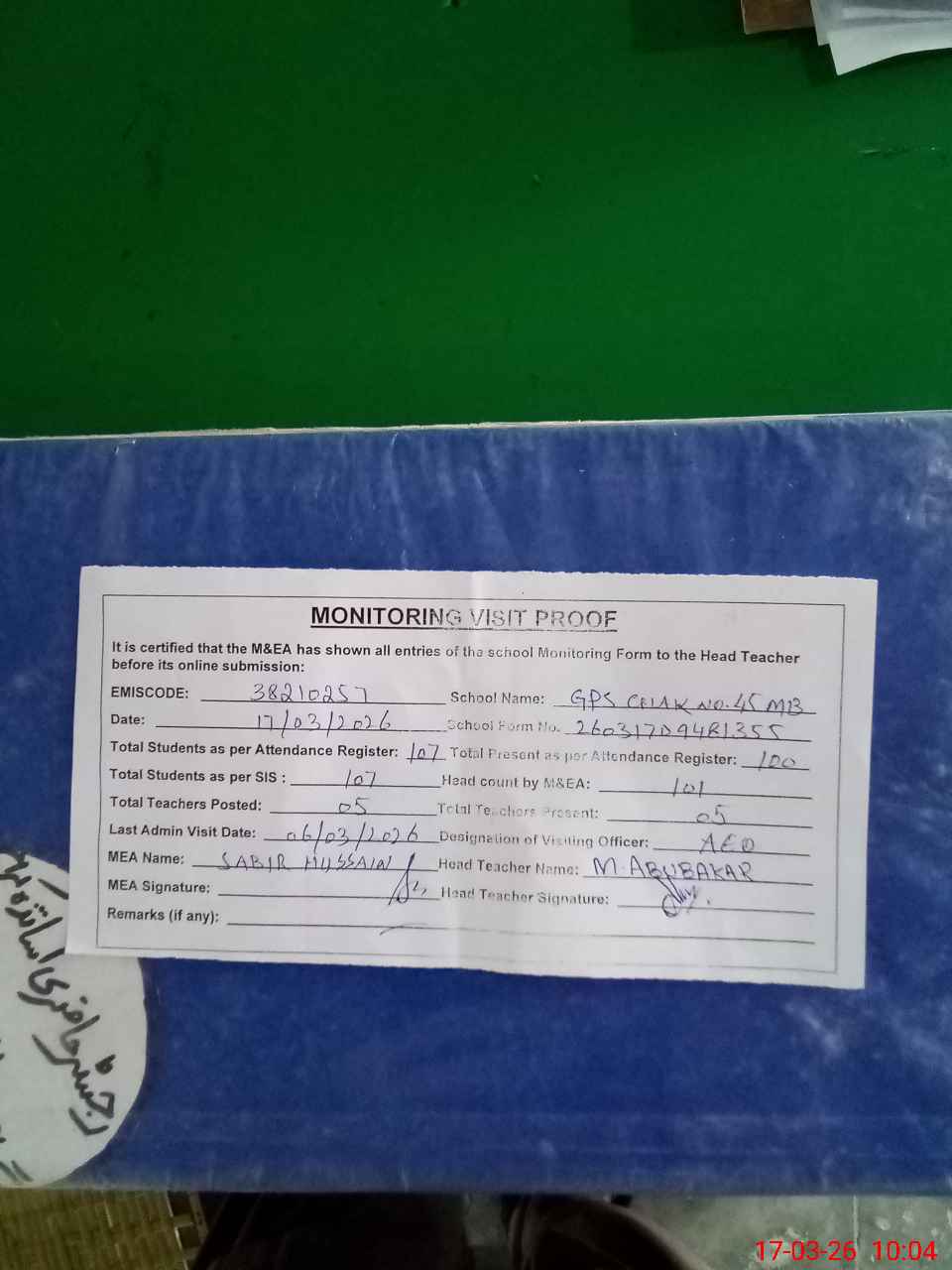 | EMIS Code: 38210257 | Name of School: GPS CHAK NO 45 MB | |||
