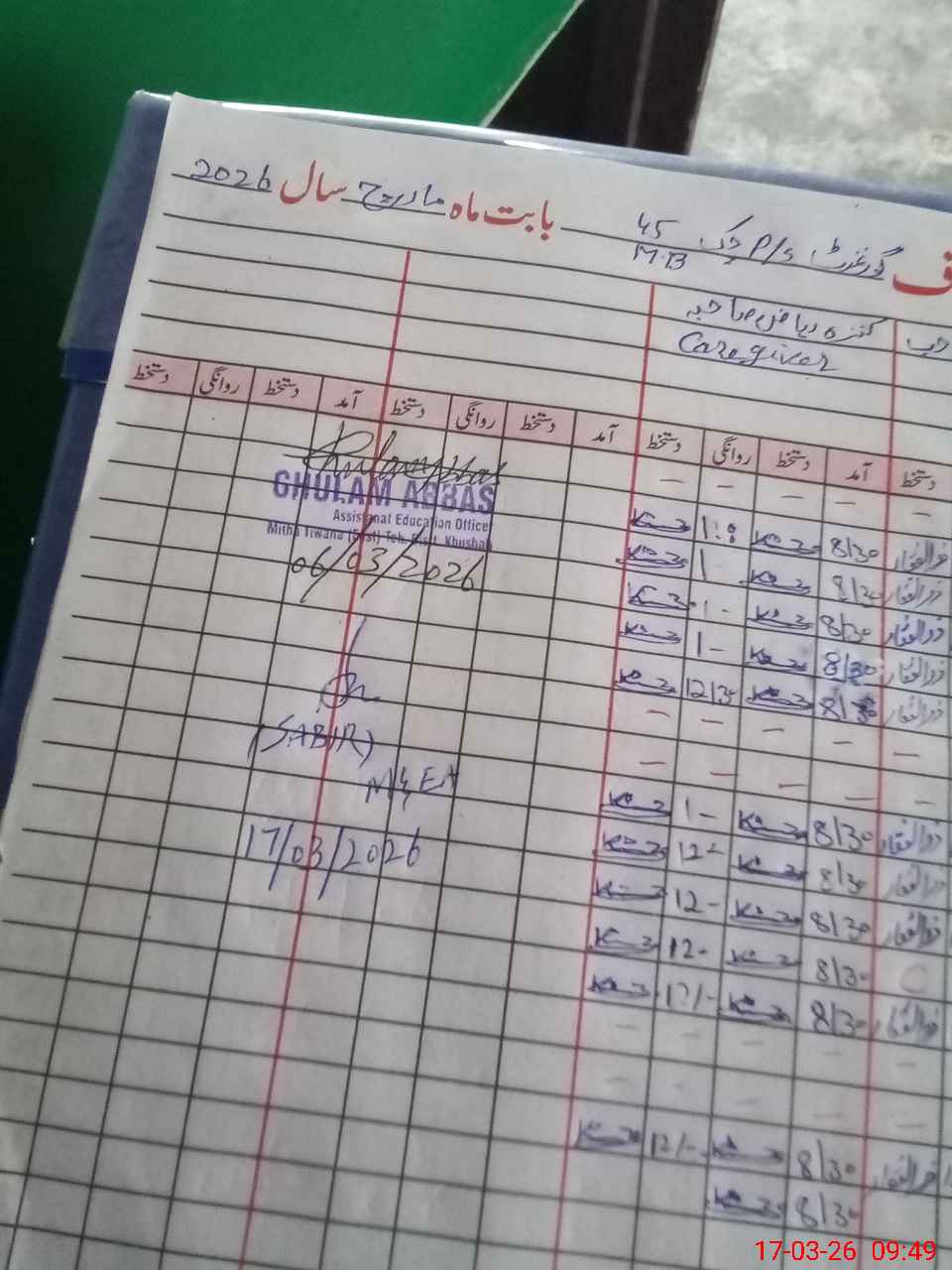 | Remarks (Use Separate Page if Required): no teacher absent total students on register 107 total students on SiS 107 last admin visit by AEO on 06 Mar 2026 | |||||