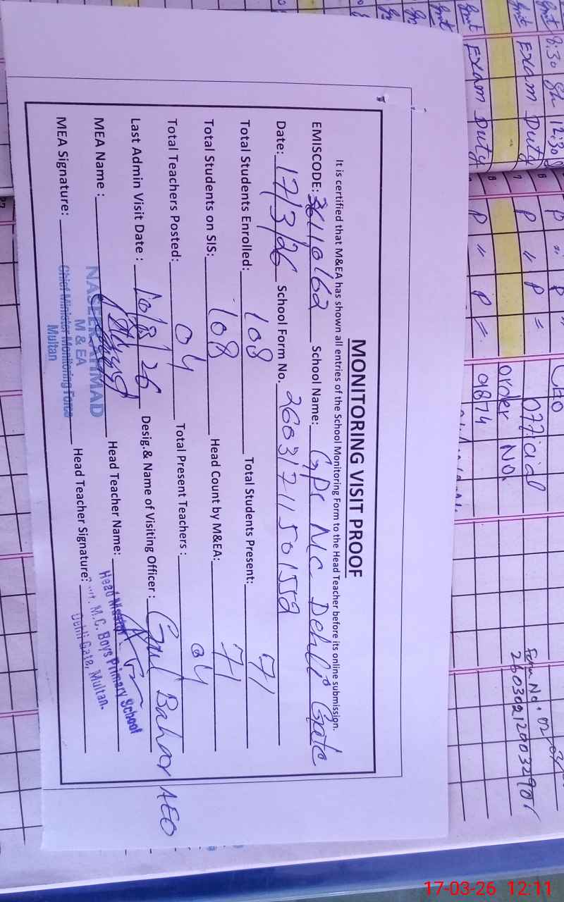 | EMIS Code: 36110162 | Name of School: GPS MC DEHLI GATE MULTAN | |||