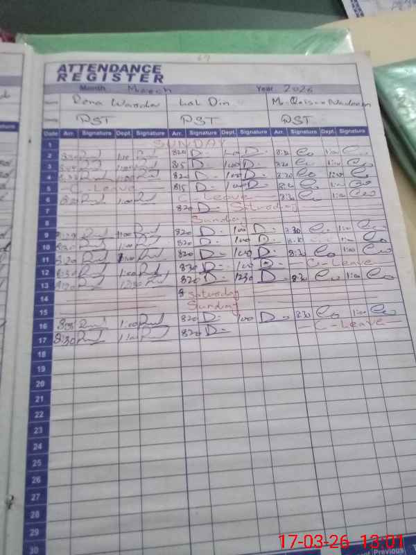 | CNIC | Full Name | Designation | R/C | Absence During Last Calender Month |
