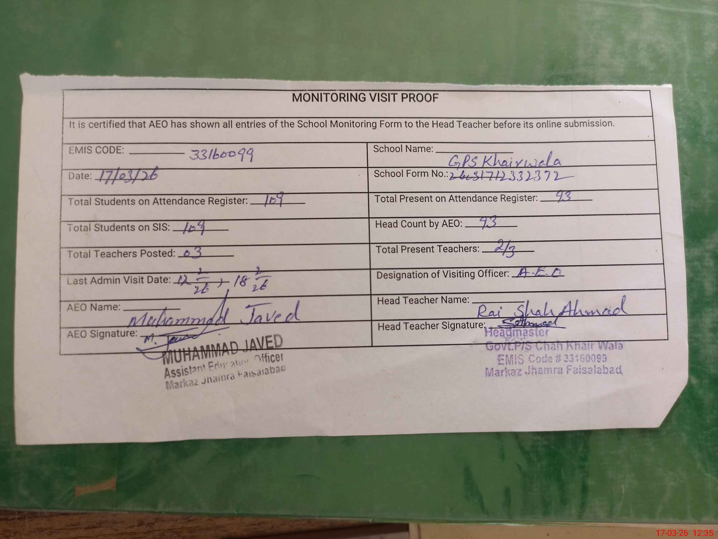 | EMIS Code: 33160099 | Name of School: GPS KHAIR WALA | |||