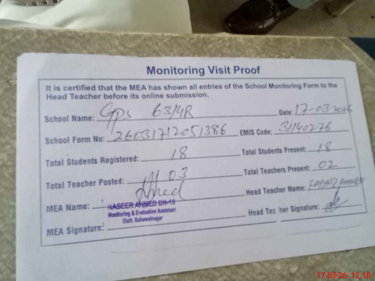| EMIS Code: 31140276 | Name of School: GPS CHAK NO. 63/4-R | |||