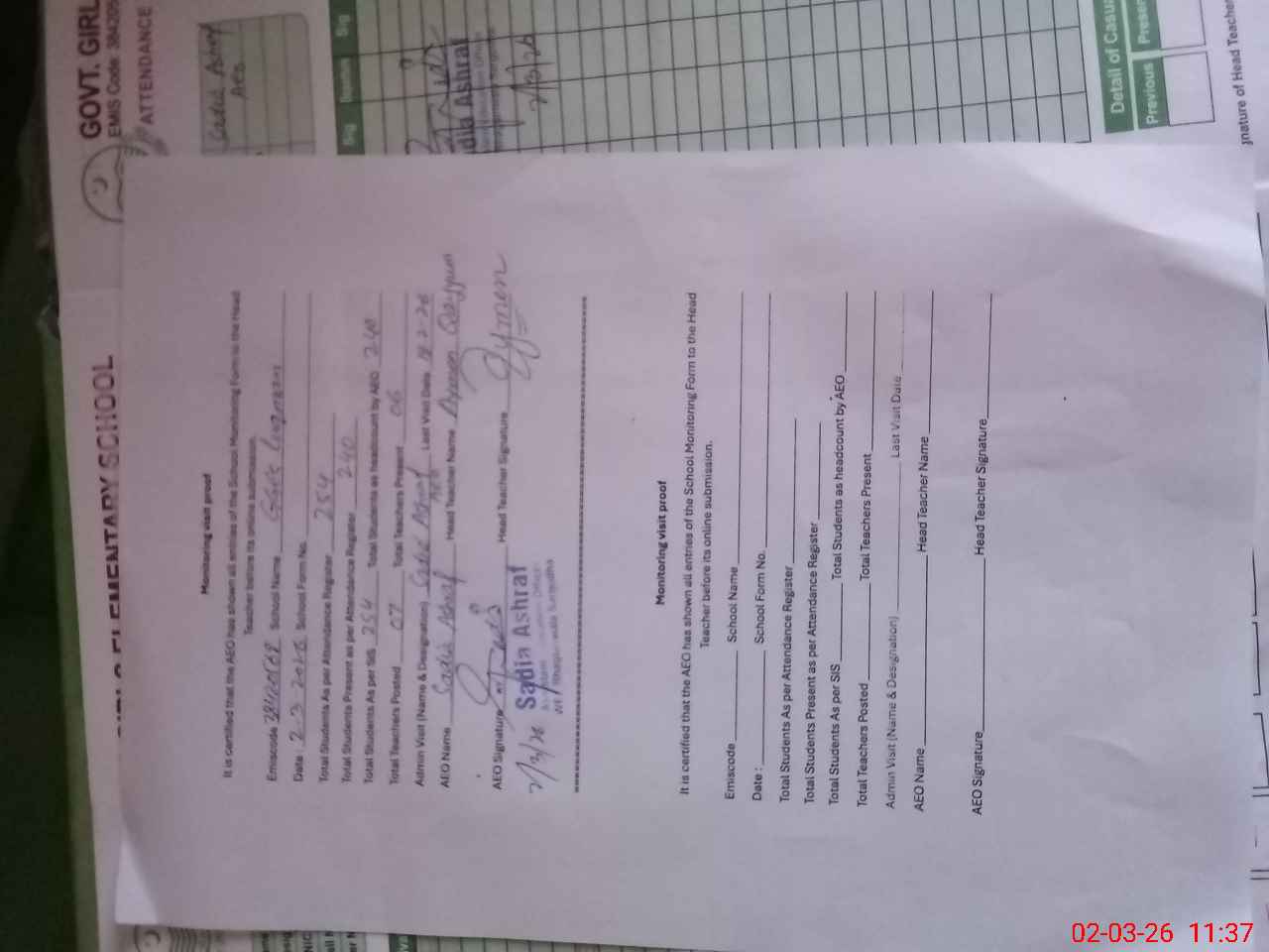 | Attendance Register | Head Teacher | MEA with School | Visit Proof |
