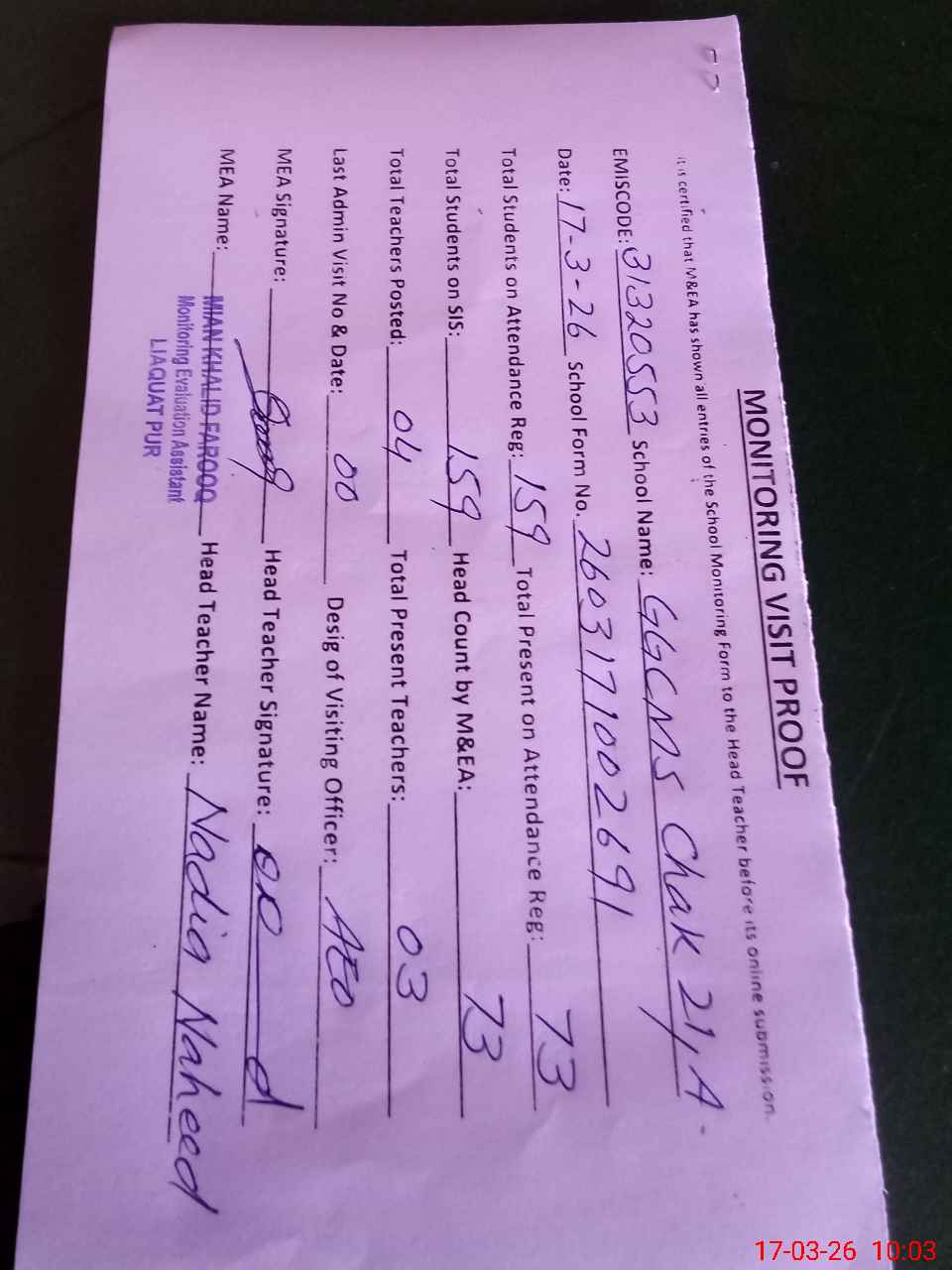 | EMIS Code: 31320553 | Name of School: GGCMS CHAK NO. 21/A | |||