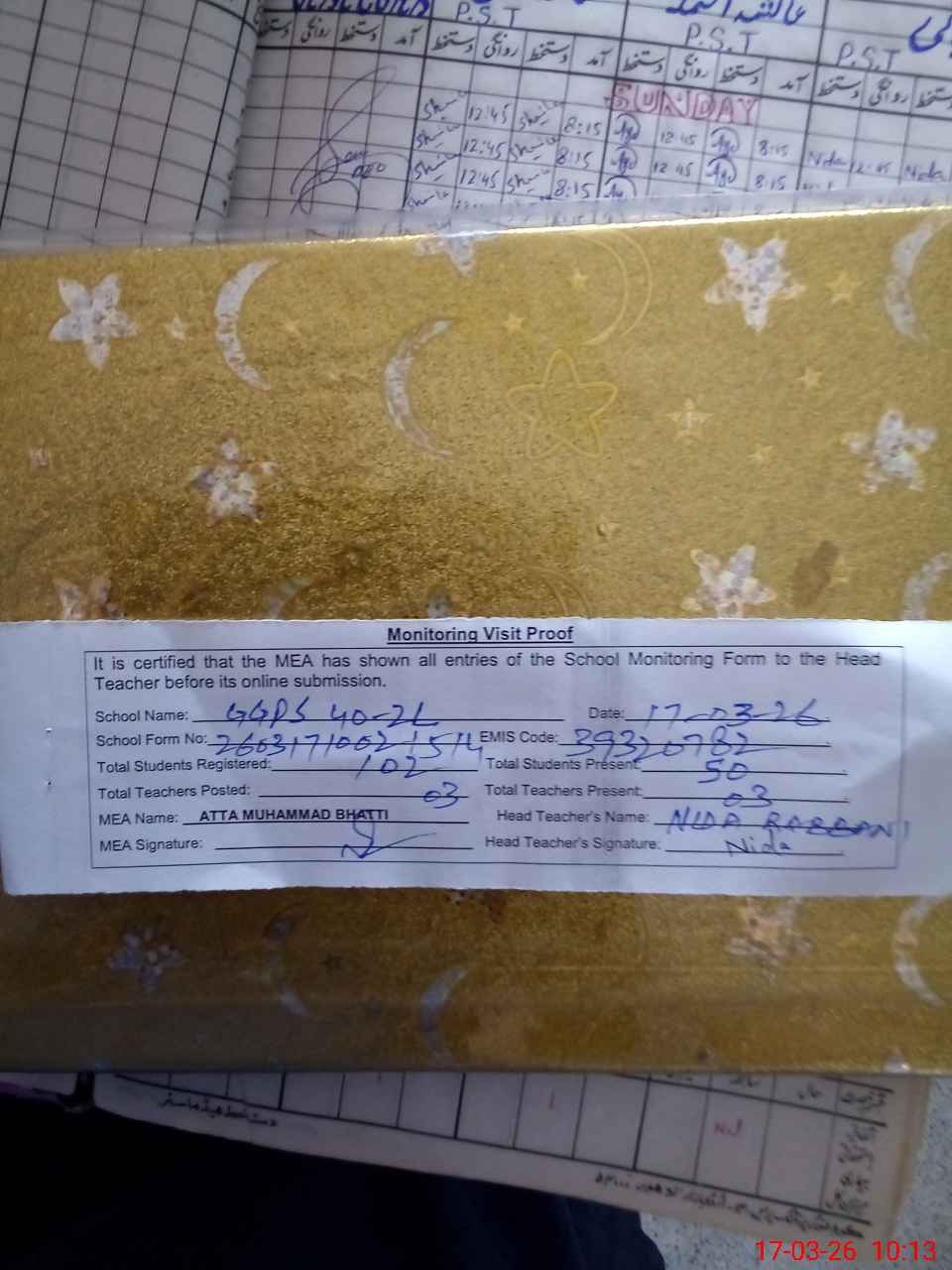 | Certified that this School was Inspected by the Undersigned MEA/DMO Today and the Information Stated Above is as Per Record. | |||||