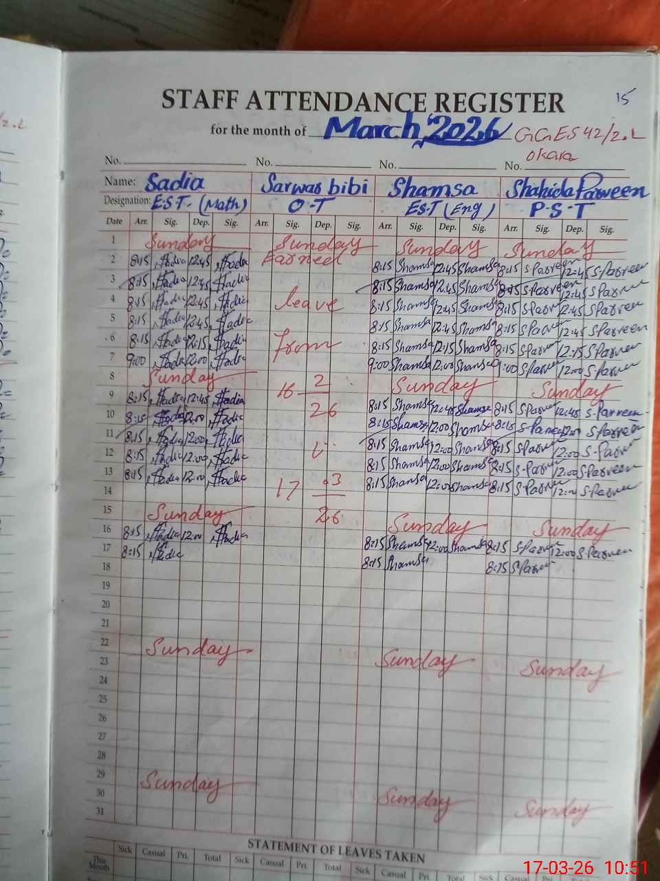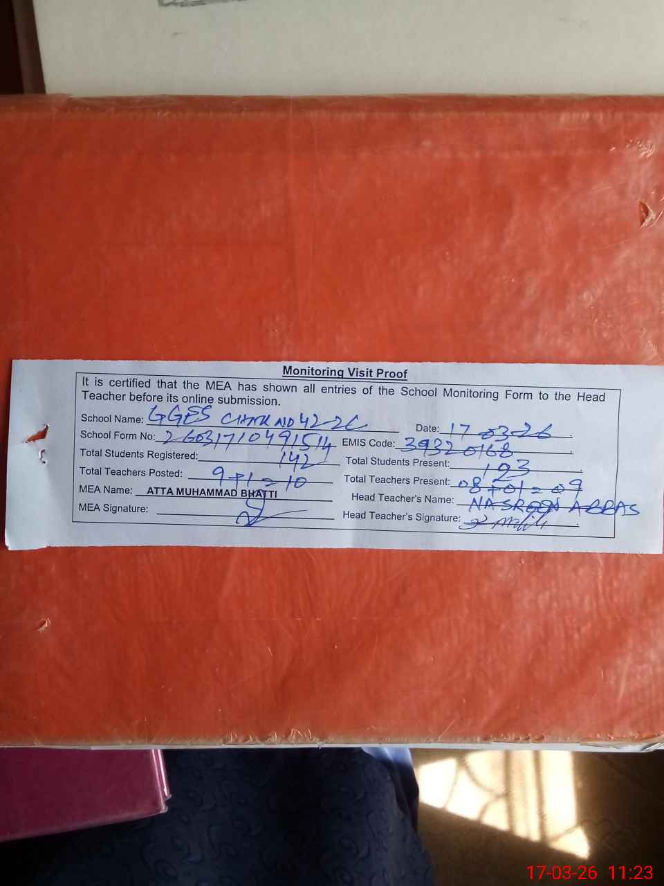 | Remarks (Use Separate Page if Required): EST Science Riffat Sana on temporary duty from GGES 5 /SP Ladhoka was present in the school Class Nursery and Three having no exam today | |||||