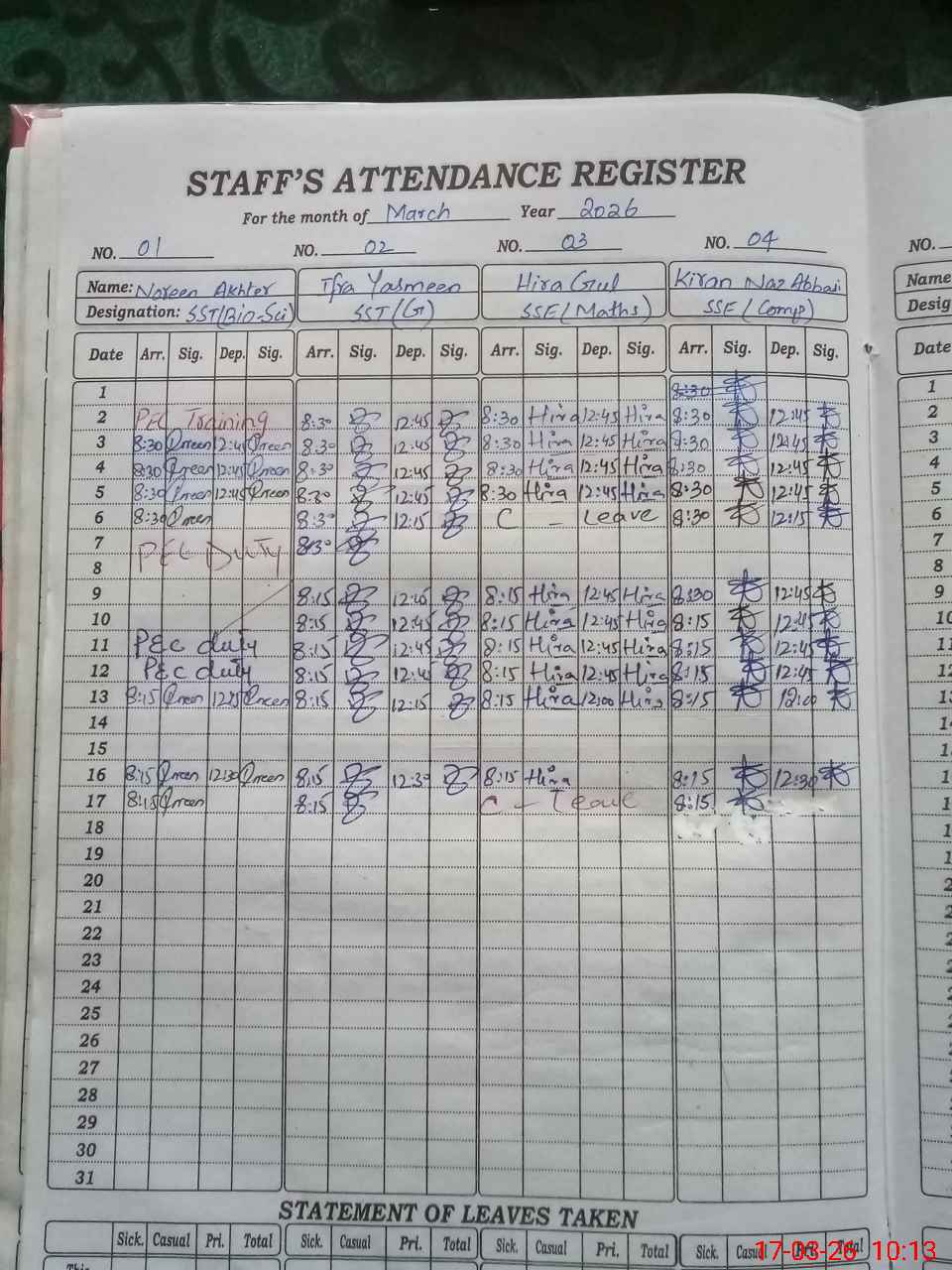 | Leave | Duty | Absent | Maternity | Medical | Ex- Pak |