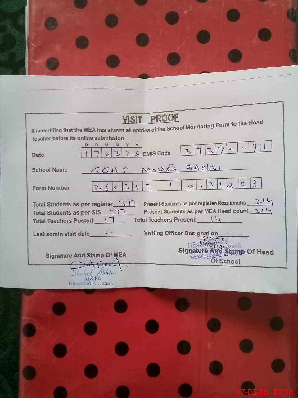 | Attendance Register | Head Teacher | MEA with School | Visit Proof |