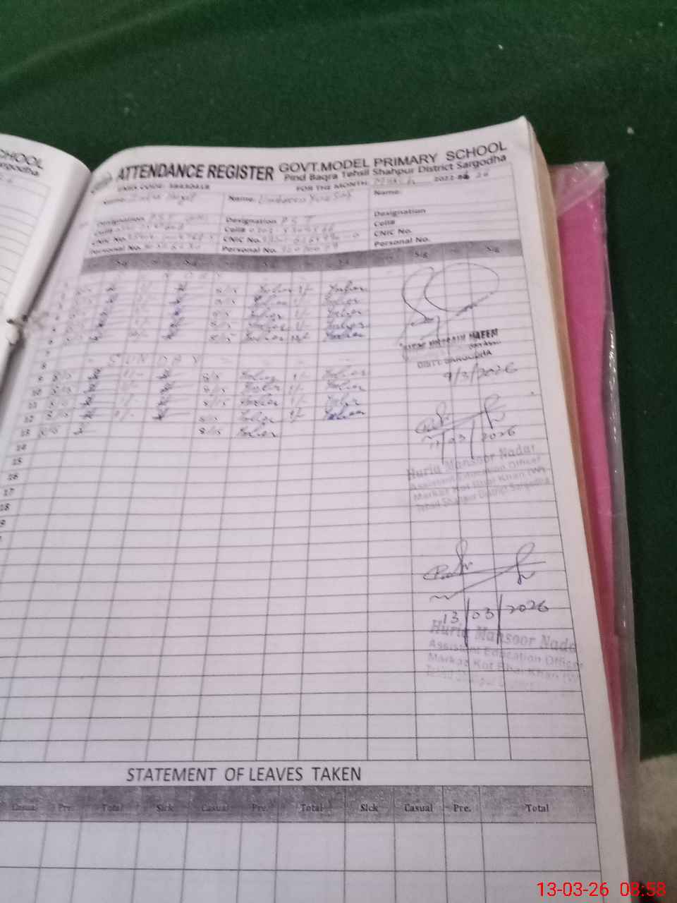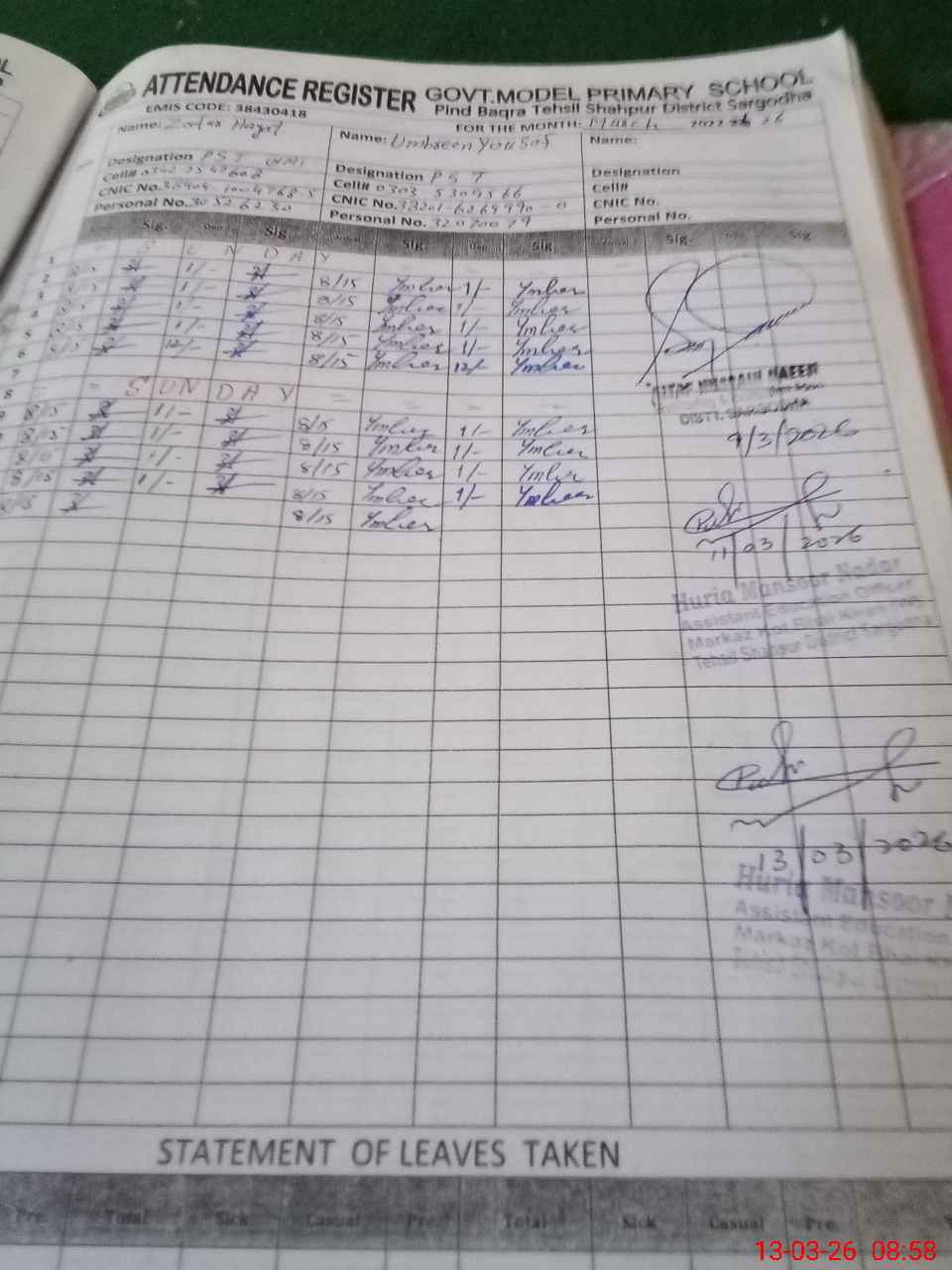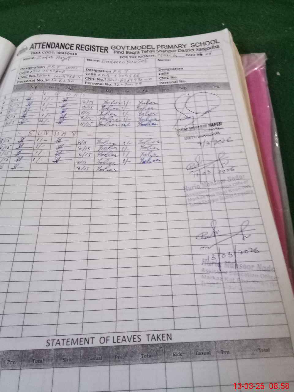 | Name: ZA**** HA**** Designation: (School Headmaster's/Headmistress's) PST Phone/Cell Number: 03**** |