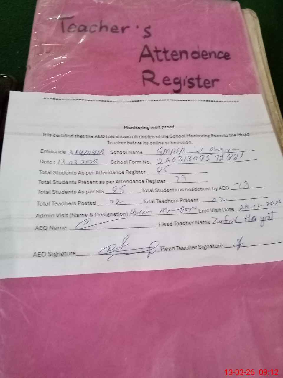 | Attendance Register | Head Teacher | MEA with School | Visit Proof |