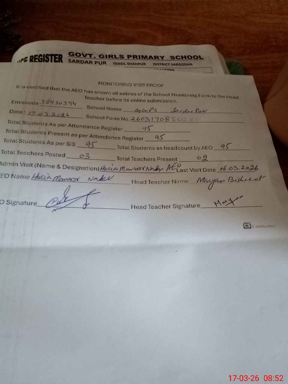 | Attendance Register | Head Teacher | MEA with School | Visit Proof |