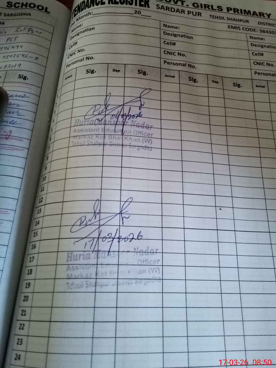 | Name: MA**** BI**** Designation: (School Headmaster's/Headmistress's) PST Phone/Cell Number: 03**** |