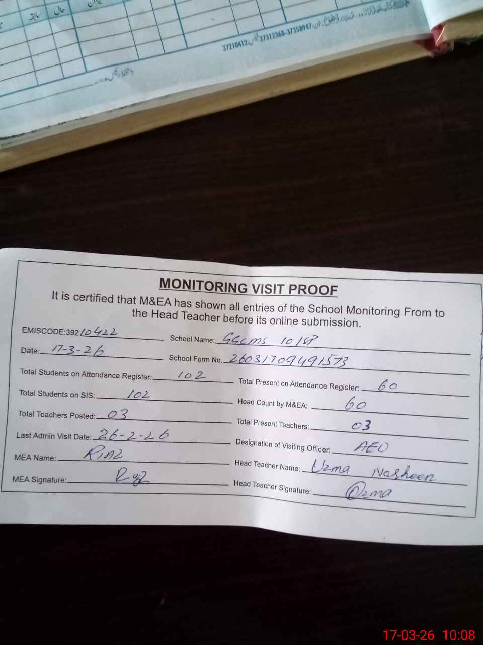 | Attendance Register | Head Teacher | MEA with School | Visit Proof |
