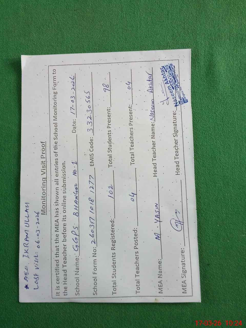 | EMIS Code: 33230565 | Name of School: GGPS BHANGOO NO 1 | |||