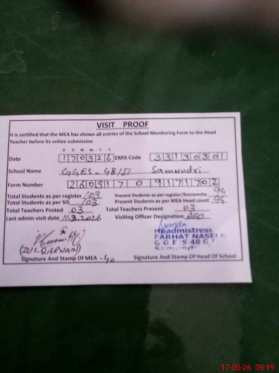 | Attendance Register | Head Teacher | MEA with School | Visit Proof |