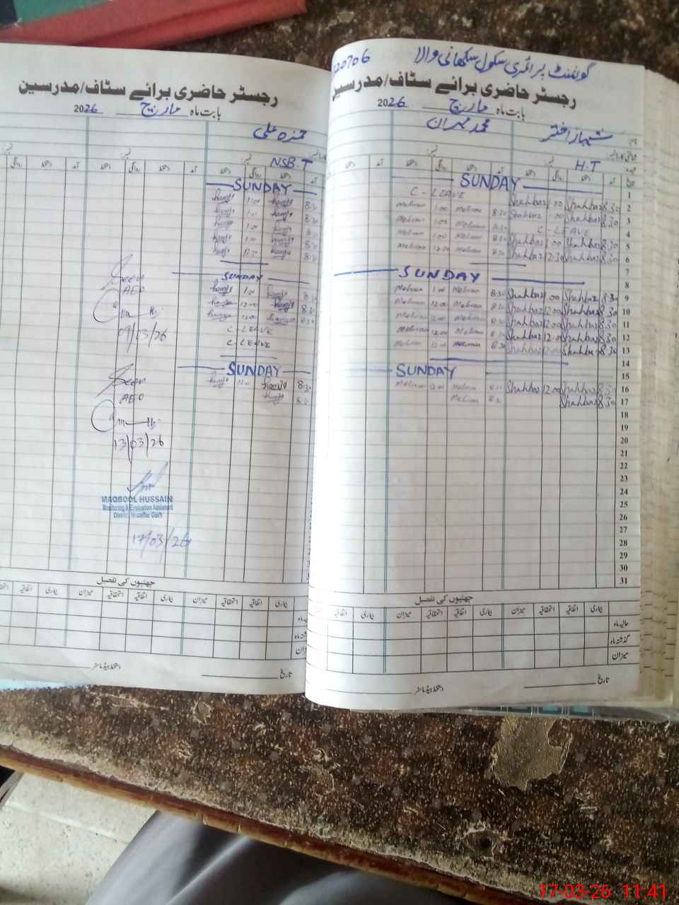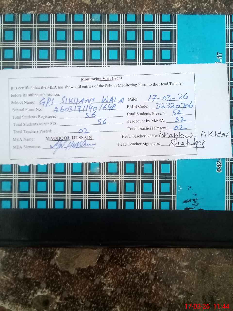 | Attendance Register | Head Teacher | MEA with School | Visit Proof |