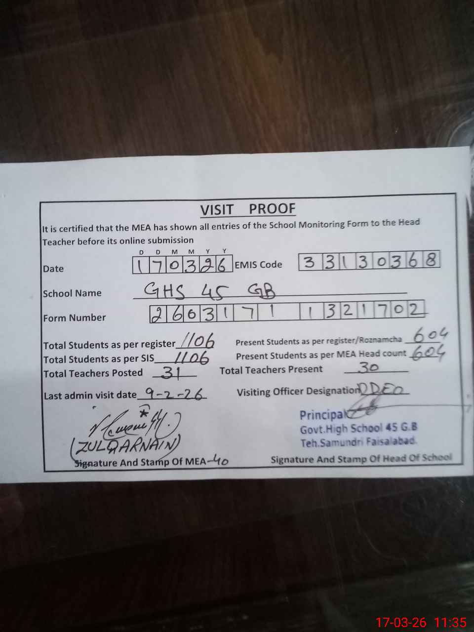 | Attendance Register | Head Teacher | MEA with School | Visit Proof |