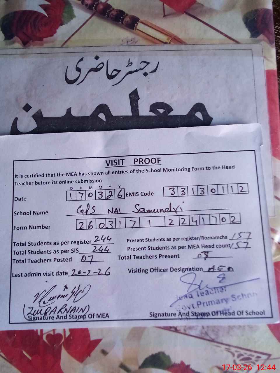 | Attendance Register | Head Teacher | MEA with School | Visit Proof |