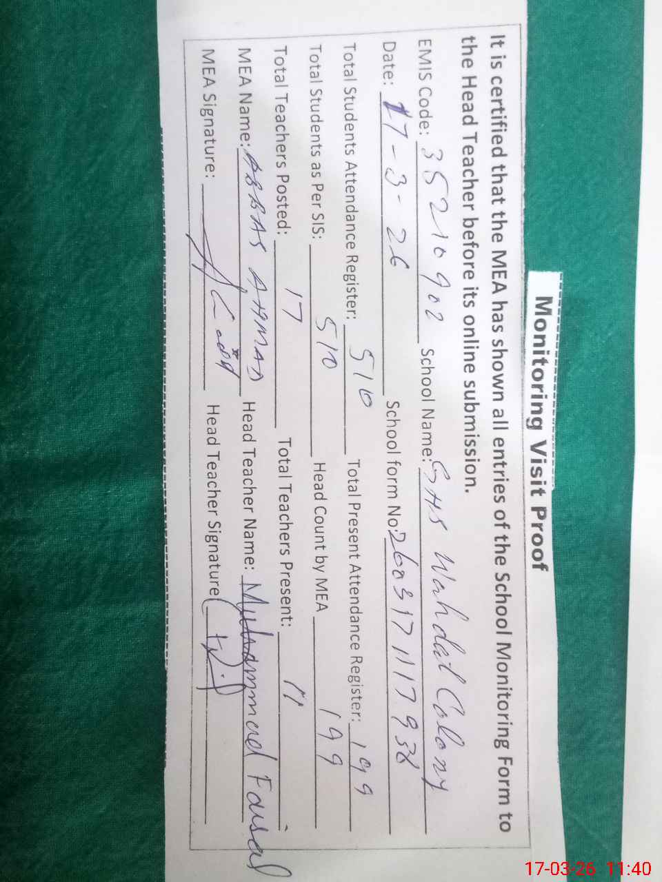 | Attendance Register | Head Teacher | MEA with School | Visit Proof |