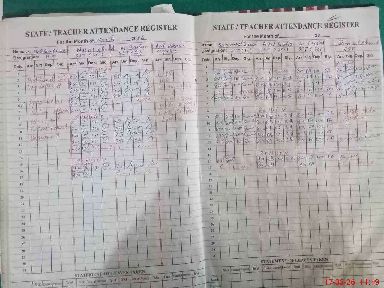 | CNIC | Full Name | Designation | R/C | Absence During Last Calender Month |