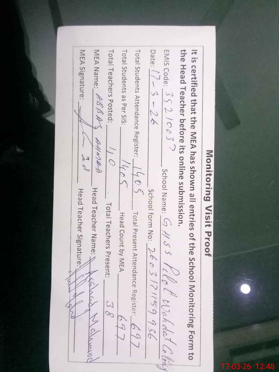 | Attendance Register | Head Teacher | MEA with School | Visit Proof |