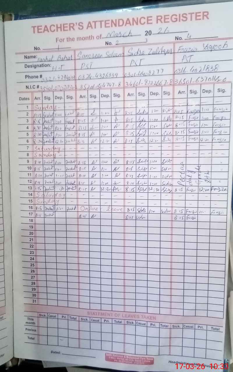 | Remarks (Use Separate Page if Required): Teacher Iram Sheikh est is temporarily attached to this school from other school. Islam & Farooq SG are attached to other places. | |||||