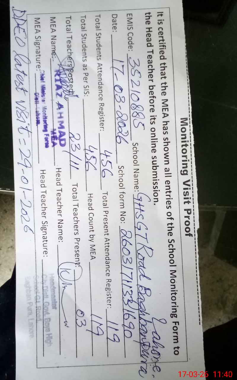 | EMIS Code: 35210885 | Name of School: GHS G.T. ROAD BAGHBAN PURA (EX-MCL) | |||