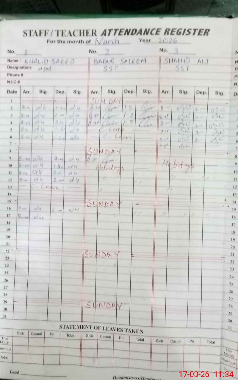 | Remarks (Use Separate Page if Required): DDEO VISITED THIS SCHOOL ON 29/01/26. class four, seven,one & two today present due to exame other classes are on exame off today. Total teachers are 11 Total teachers present are 03, according to the holidays announced by the government w e f 10/03/26. Total present students are 119 | |||||