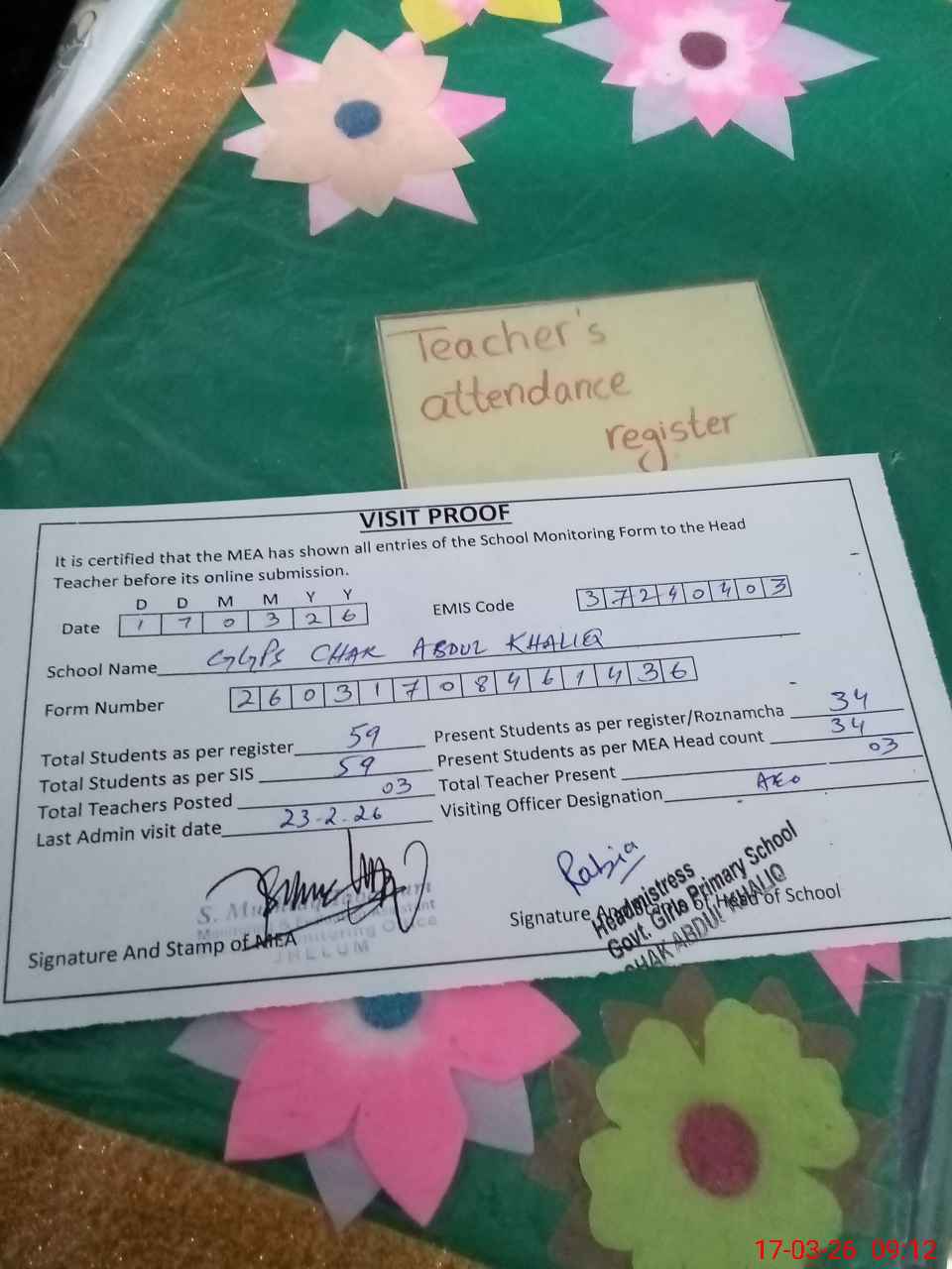 | Attendance Register | Head Teacher | MEA with School | Visit Proof |