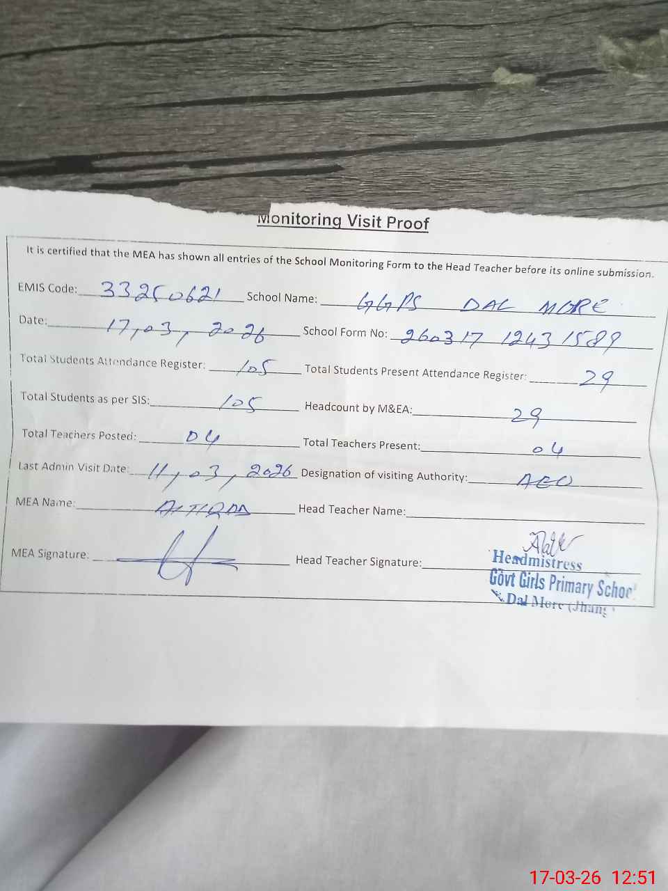 | Attendance Register | Head Teacher | MEA with School | Visit Proof |