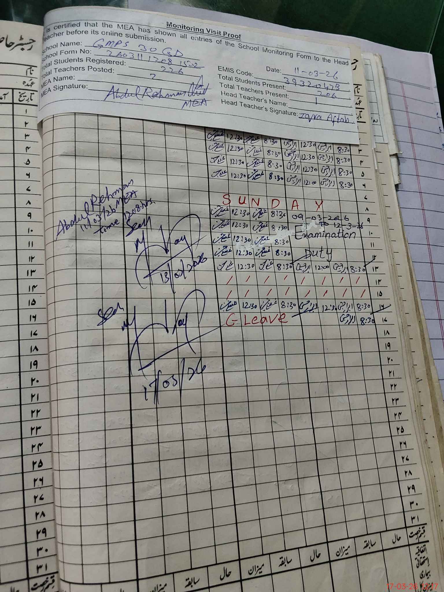 | Attendance Register | Head Teacher | MEA with School | Visit Proof |