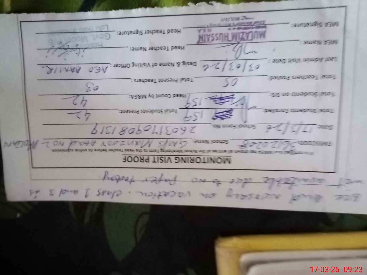 | Remarks (Use Separate Page if Required): teacher gull iram on iddet leave but found no documents or online proof so marked absent ece nursery on vacation and 1 & 3 with no paper today so marked all 4 zero model school but have 1 building | |||||