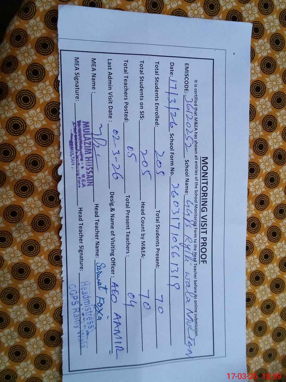 | EMIS Code: 36120252 | Name of School: GGPS RAYTLI WALA CHAH RATLI WALA SHUJABAD | |||
