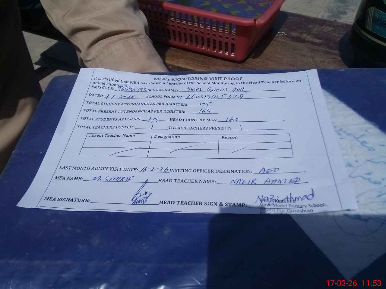 | Attendance Register | Head Teacher | MEA with School | Visit Proof |