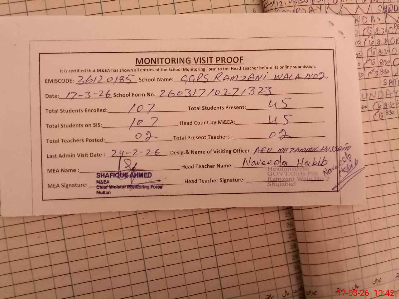 | Attendance Register | Head Teacher | MEA with School | Visit Proof |