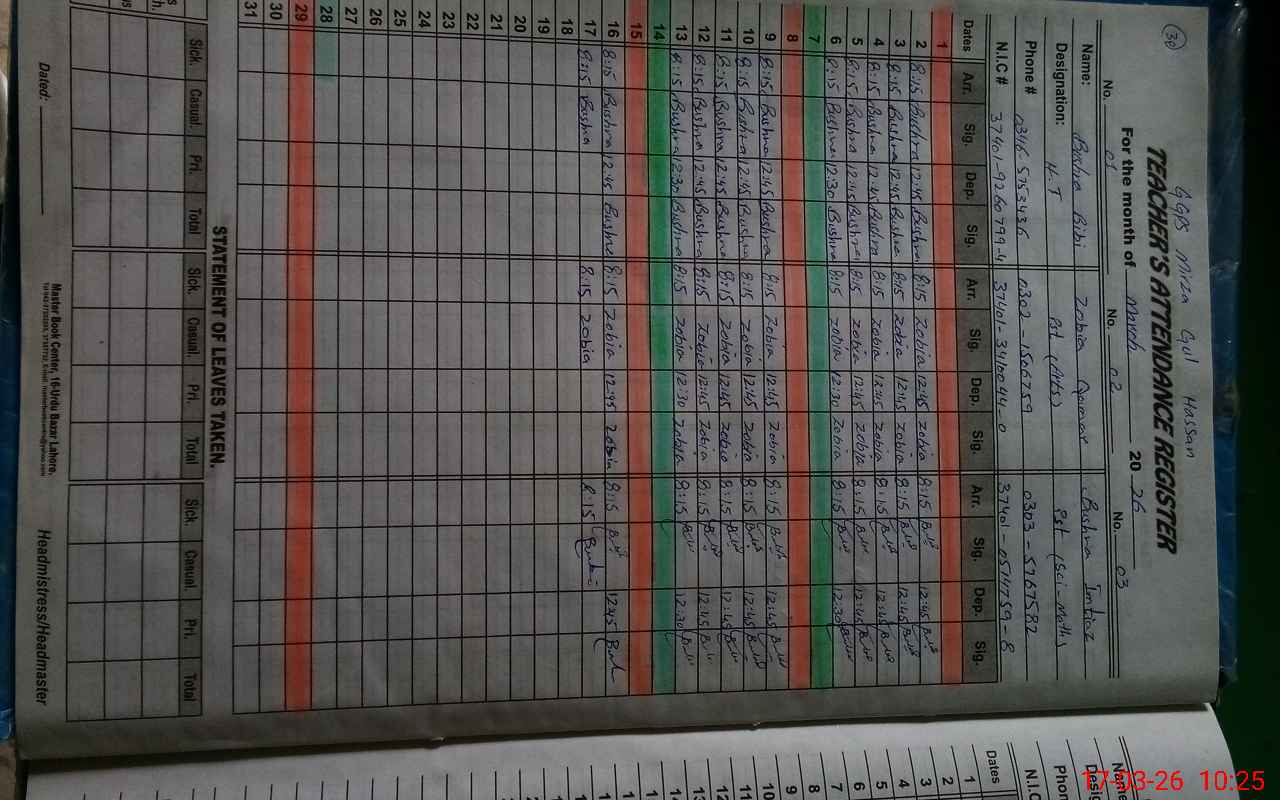 | CNIC | Full Name | Designation | R/C | Absence During Last Calender Month |