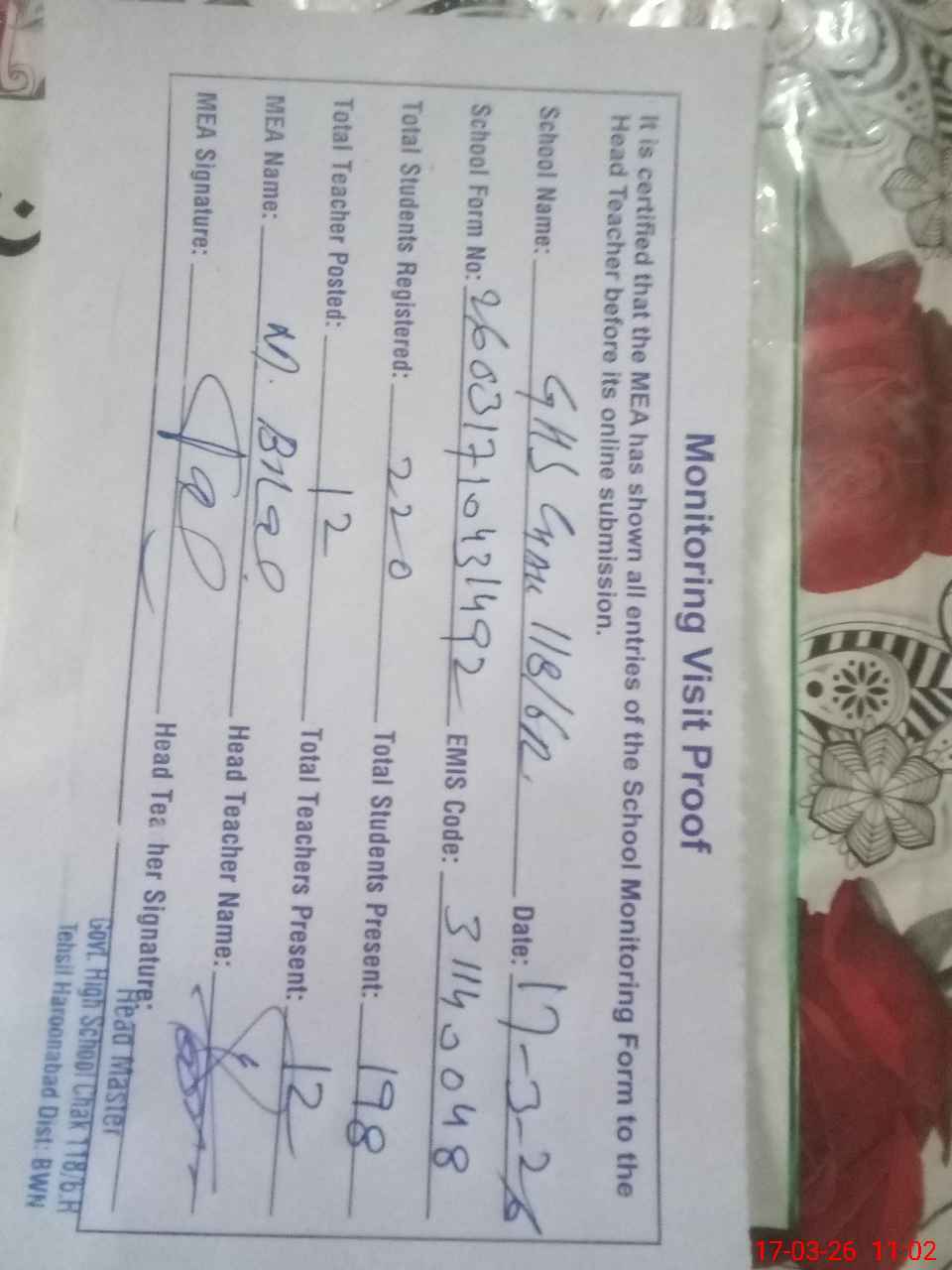 | Attendance Register | Head Teacher | MEA with School | Visit Proof |