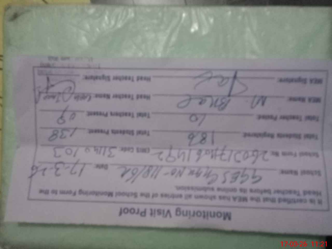 | Attendance Register | Head Teacher | MEA with School | Visit Proof |