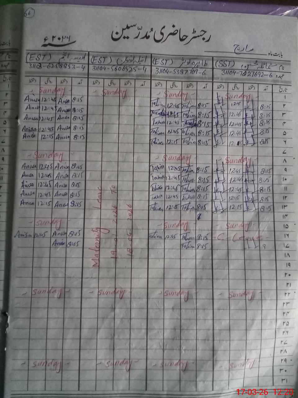 | 31**** | Na**** Na**** | PST Science/Maths | Regular | 0 | 0 | 0 | 0 | 0 | 0 | 0 | 0 | 0 | Absent (Un-Authorized) |