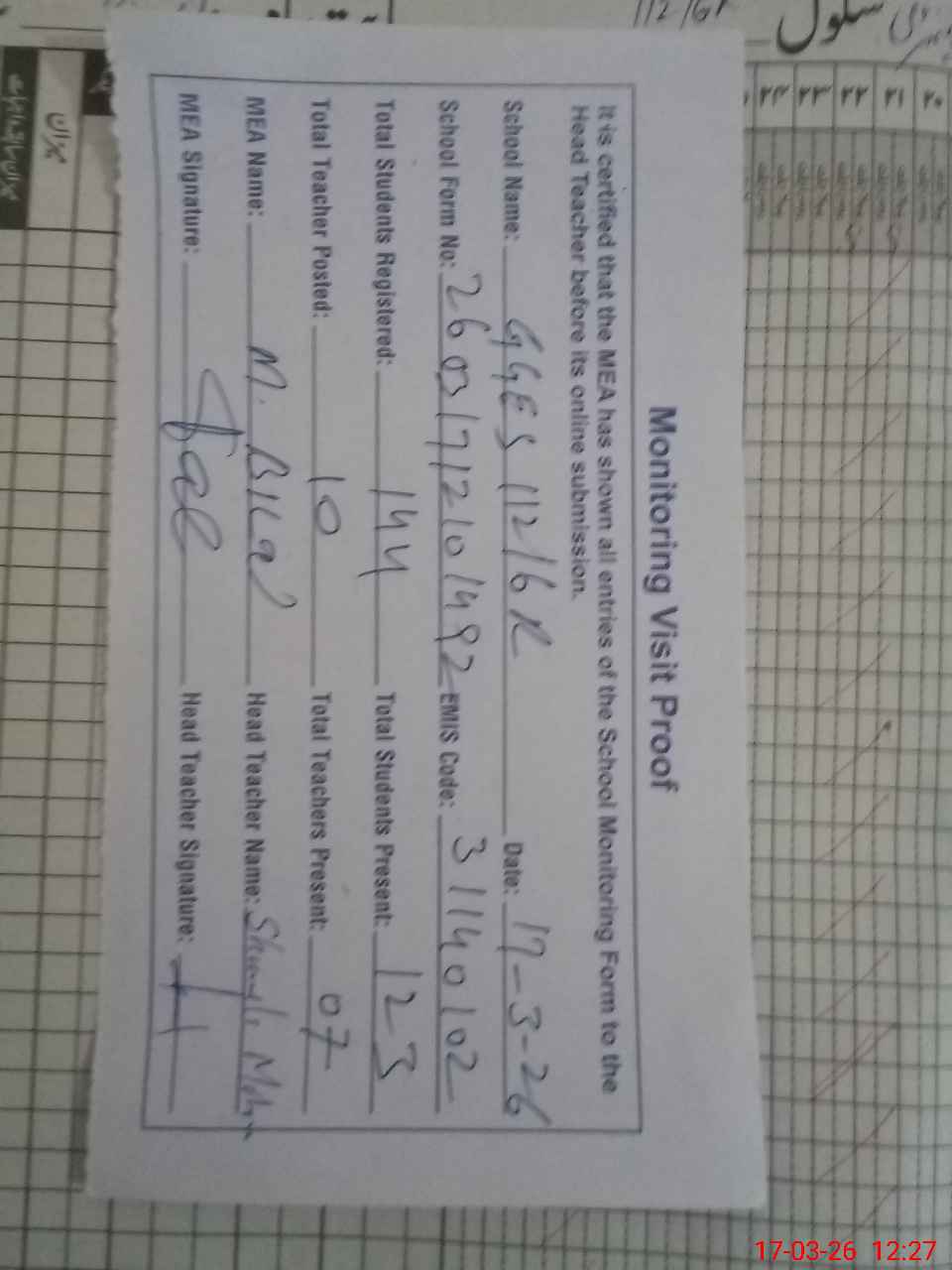 | Attendance Register | Head Teacher | MEA with School | Visit Proof |