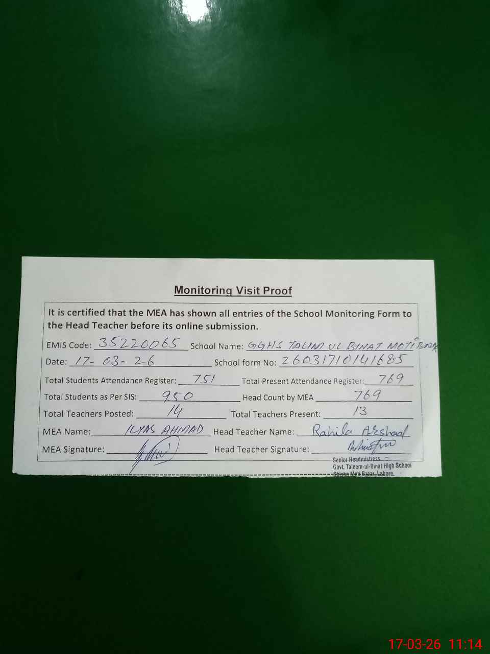 | Attendance Register | Head Teacher | MEA with School | Visit Proof |