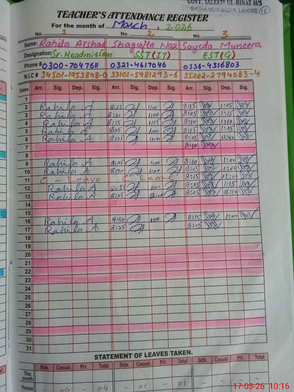 | CNIC | Full Name | Designation | R/C | Absence During Last Calender Month |