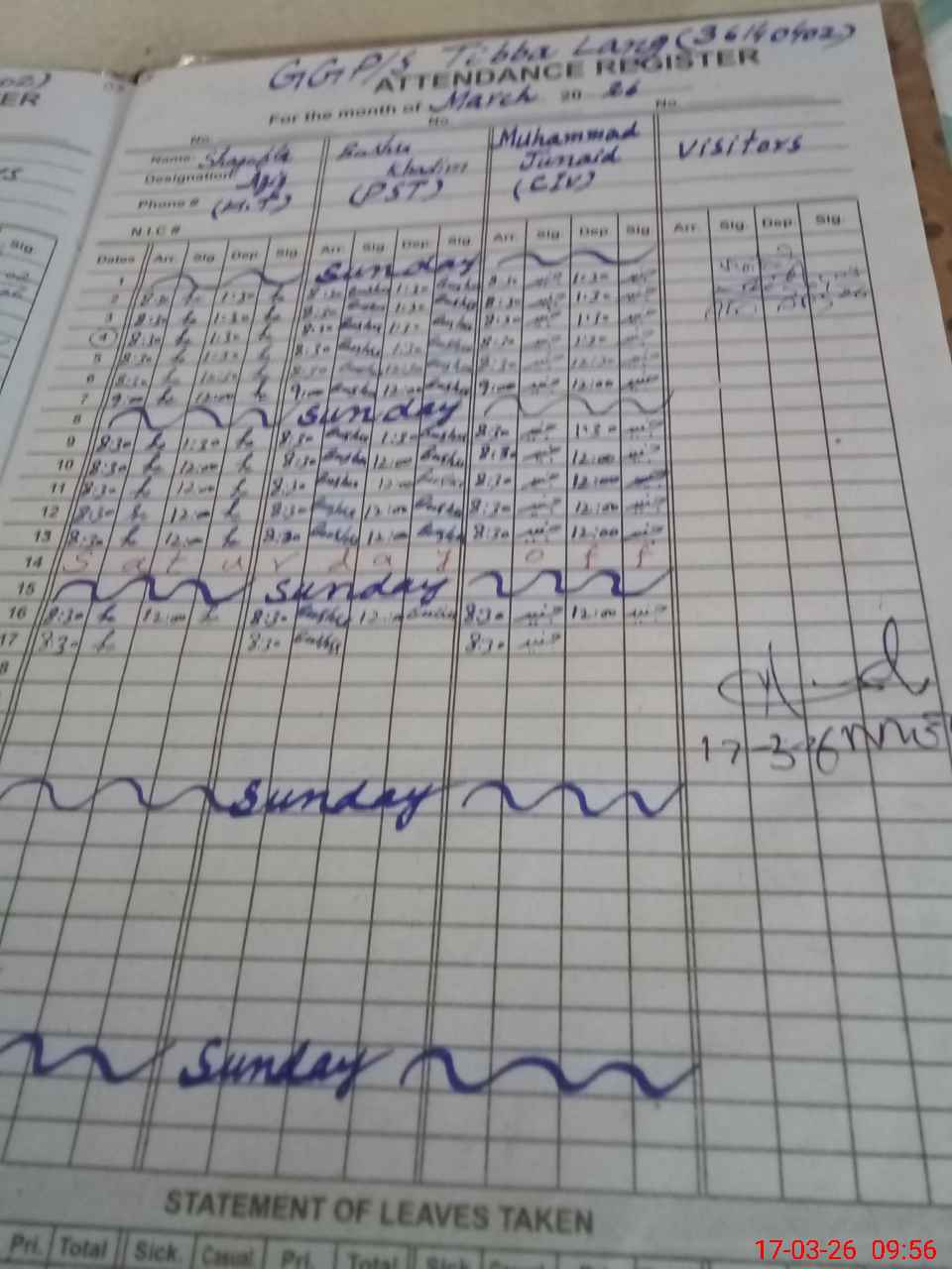 | CNIC | Full Name | Designation | R/C | Absence During Last Calender Month |