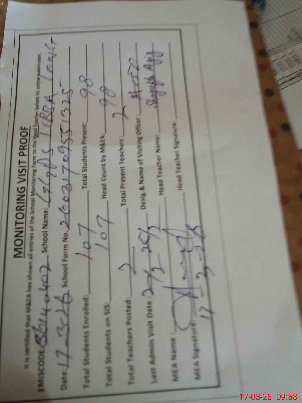 | Attendance Register | Head Teacher | MEA with School | Visit Proof |