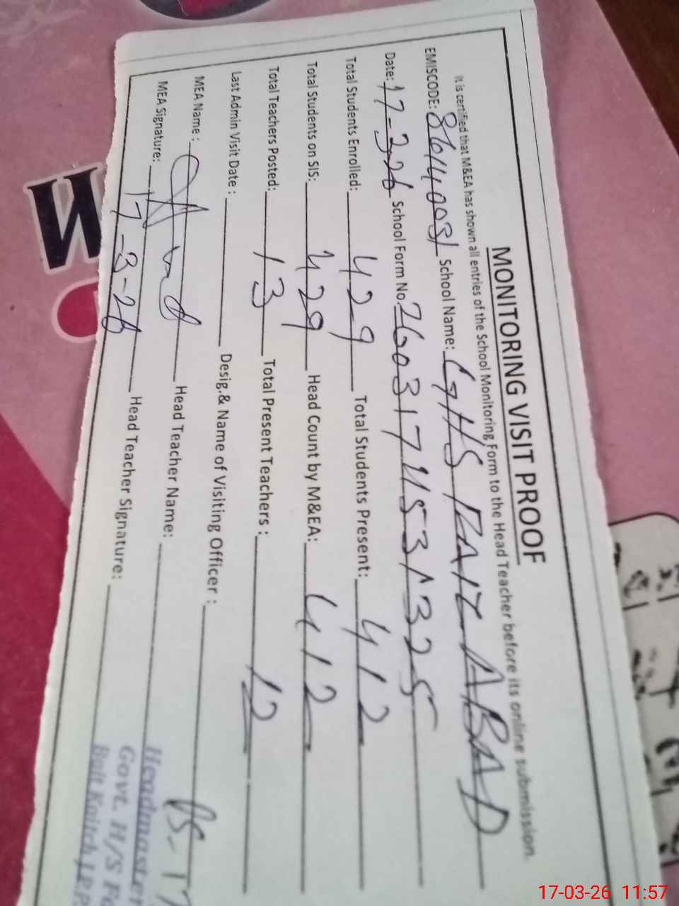 | Attendance Register | Head Teacher | MEA with School | Visit Proof |