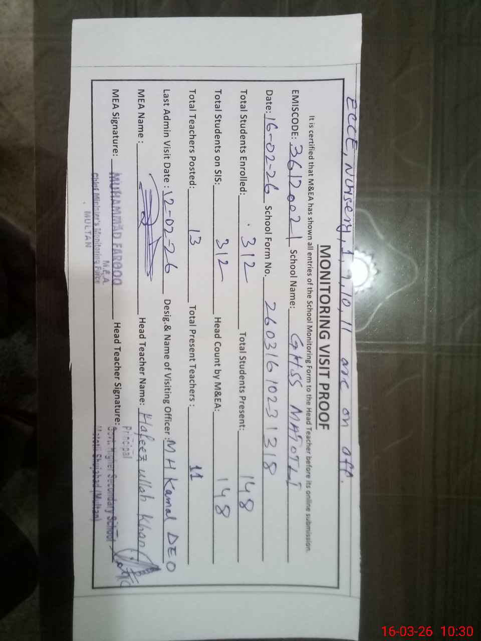 | Certified that this School was Inspected by the Undersigned MEA/DMO Today and the Information Stated Above is as Per Record. | |||||
