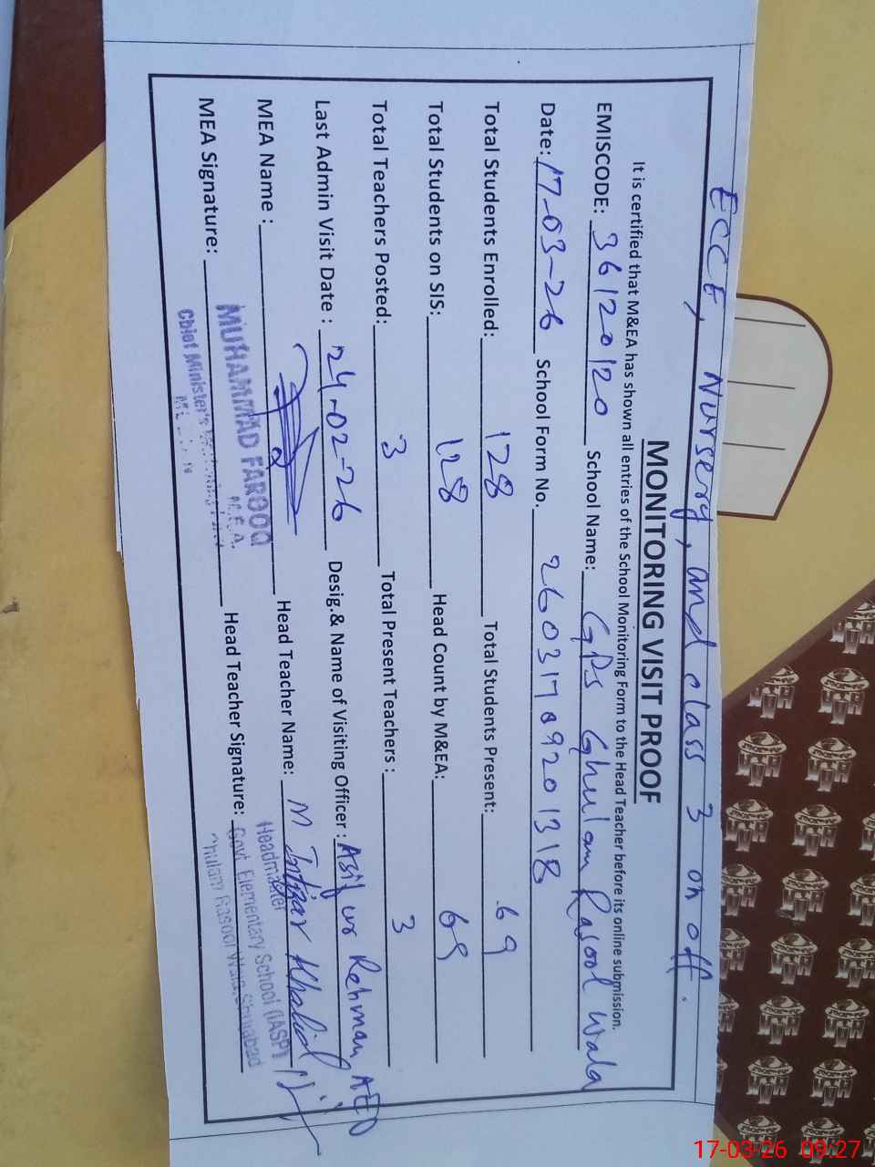| Attendance Register | Head Teacher | MEA with School | Visit Proof |