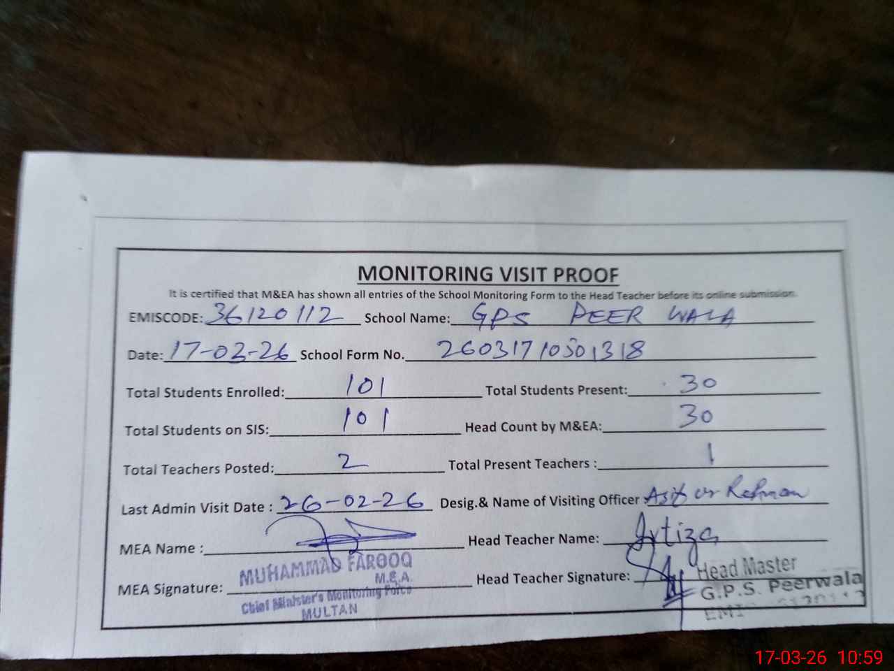 | EMIS Code: 36120112 | Name of School: GPS PEER WALA P/O THATH GHALWAN | |||
