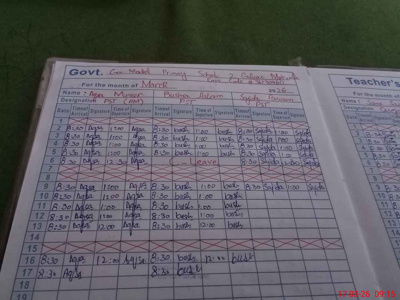 | Remarks (Use Separate Page if Required): today class 1 2 4 5 were not present due to Sajida perveen pst was expired on 9 march | |||||