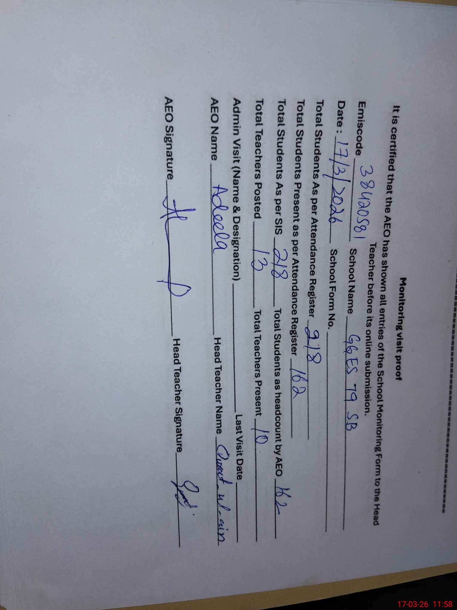 | Attendance Register | Head Teacher | MEA with School | Visit Proof |